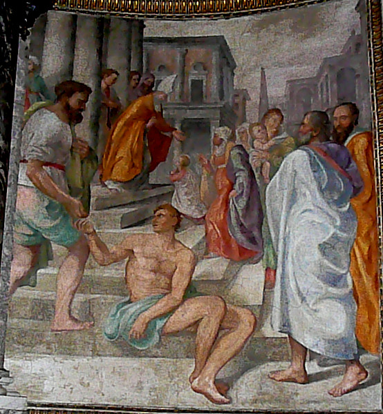 The modern sensibility may shudder at the thought of bringing a small child into service in a temple, but this painting makes it a double of the act of charity in the foreground. Also presented for the viewer's contemplation is what the beggar's well toned body says about the small child that is his compositional double.