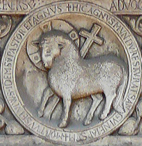 The inscription reads HIC AGNUS MUNDUM RESTAURAT SANGUINE LAPSUM . MORTUUS ET VIVUS IDEM SUM PASTOR ET AGNUS, "Here the Lamb restores the fallen world. Both dead and alive I am shepherd and sheep." The second sentence could be a reference to the name of St. Pastor, which means "shepherd" and who is represented on this same frieze.