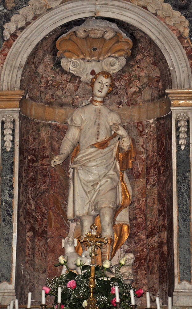 St. Vitus is customarily pictured as a youth with curly blond hair. He saved himself from the lions and the molten lead by making the sign of the cross, so in some images he holds a cross (example). In San Vito lo Capo, the town named for him in Sicily, the attribute in his images is a dog or pair of dogs, as in the first picture at right. There is also a dog in this portrait in a church in Rome. In the 17th century the historian Rocco Pirri noted that in San Vito lo Capo the saint was invoked for protection against the bite of rabid dogs. To this day a spring with healing waters is maintained beneath his church, where Pirri says the saint saved a boy that a dog had bitten and left its teeth in his arm.3 ![]()