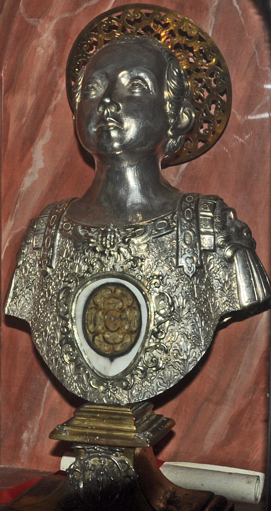 ![]() A pair of dogs serve as the saint's attribute in a medallion of St. Vitus at the base of the reliquary bust in the crypt beneath the church in San Vito lo Capo, Sicily. (See the description page.) ![]() The reliquary bust. ![]() A statue of Saint Vitus in his church in San Vito lo Capo. At his feet are dogs, his attributes. (See the description page.) MORE IMAGES