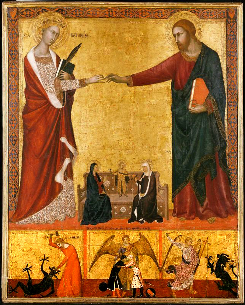 This was one of the early attempts at getting Catherine and Christ "married" without implying a physical intimacy. The method that proved most popular is seen in the little vignette between the two large figures: With mother Mary in attendance, the Christ Child hands St. Catherine the ring.